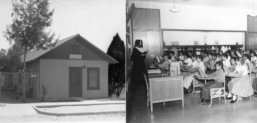 In 1950 Father Leo Gattes and Father Charles Towner brought the Sisters of Notre Dame to Glendale to operate a parish school on the church property on 55th Avenue. The school population quickly outgrew the buildings so a new school began construction on May 3. 1953 at the land acquired on Orangewood and 57th Avenue. With the first two classrooms completed, Grades 5, 6 and 7 were inaugurated on September 14, 1953; eventually Grades 3 and 4 moved in once the last two classrooms were done. Grades 2 and under continued at the old school on 55th Avenue. In July of 1954 the convent was finished for the teacher-nuns.